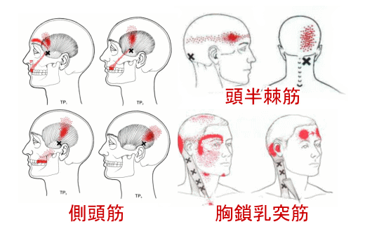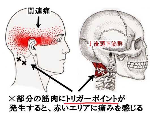 頭や首に発生したトリガーポイントがよく頭痛の原因になっており、緊張性頭痛という名で呼ばれています。