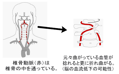 ●衝撃や筋緊張などで頸椎が捻れると、その周囲の椎骨動脈や硬膜も大きくひねられます。